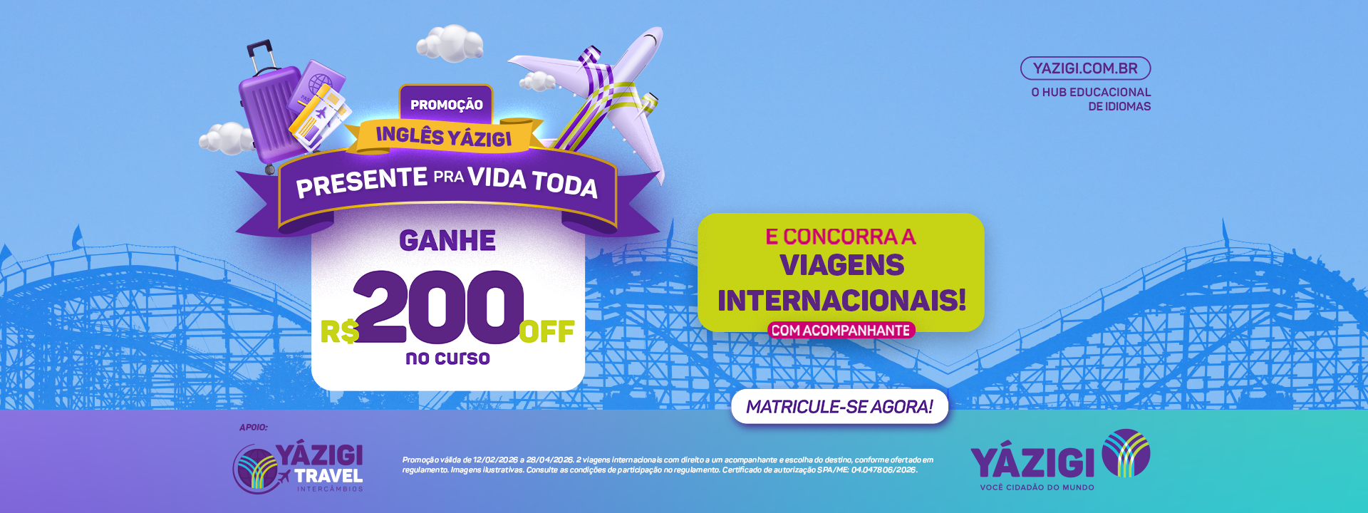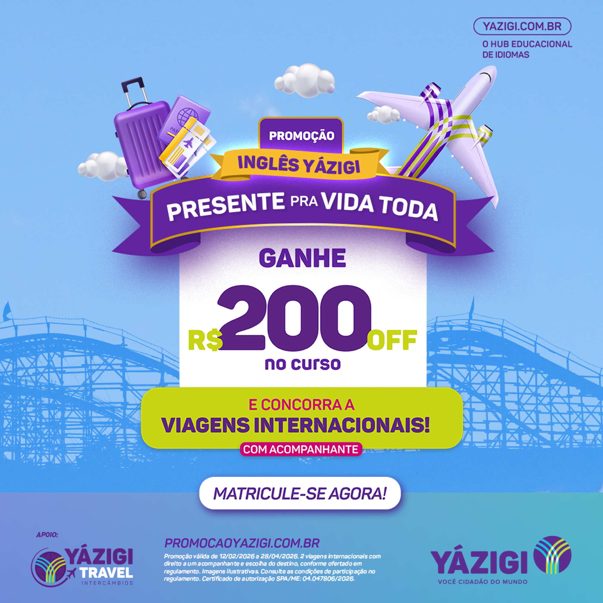 Seu inglês começa no Yázigi. E sua primeira viagem internacional também ✈️🌎 Até 20 de abril, ao se matricular, você garante R$200 OFF no curso de inglês e ainda participa de dois concursos que vão levar alunos com acompanhante para Orlando. E tem mais: 👉 TODOS os alunos matriculados participam. Aprender inglês é abrir portas. Às vezes, até as do embarque ✨ Quer participar? Acesse o link e encontre a unidade mais próxima para garantir sua matrícula: https://www.yazigi.com.br/promocoes/presenteyazigi/?utm_source=post_facebook&utm_medium=social&utm_campaign=promocao_q1 #Yazigi #InglesQueLevaLonge #Orlando #AprenderIngles