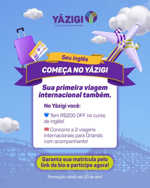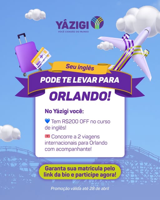 Seu inglês pode começar na sala de aula…e terminar em uma viagem internacional 😍✈️ Até o dia 28 de abril, você garante R$200 OFF no curso de inglês e ainda pode participar do concurso que vai levar 2 alunos com acompanhante para Orlando🌎✨ E o melhor: 👉 TODOS os alunos Yázigi matriculados participam do concurso. É a sua chance de aprender inglês e viver uma experiência internacional de verdade 💙 Quer participar? Comente aqui “Eu quero!” e te enviamos o link de inscrição na DM! Ou Corre para o link da bio, encontre a unidade mais próxima para garantir sua matrícula agora! #Yazigi #InglesQueLevaLonge #Orlando #AprenderIngles