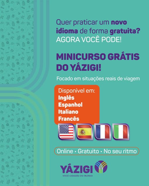 O Yázigi liberou um mini curso online 100% gratuito, e você pode começar hoje! 💙 O curso é focado em situações reais de viagem, ideal para quem quer começar ou praticar o idioma de forma leve e prática ✈️🌎 Você pode escolher entre os idiomas: 🇺🇸 Inglês 🇪🇸 Espanhol 🇮🇹 Italiano 🇫🇷 Francês É online, gratuito e você faz no seu tempo. Quer o acesso? 👀 Acesse o link a seguir, selecione o idioma de sua preferência e comece os estudos agora mesmo! https://www.yazigi.com.br/promocoes/minicurso/?utm_source=post_facebook&utm_medium=social&utm_campaign=minicursos-gratis #Yazigi #MiniCursoGratuito #AprenderIdiomas #CursoOnline #Yazigi
