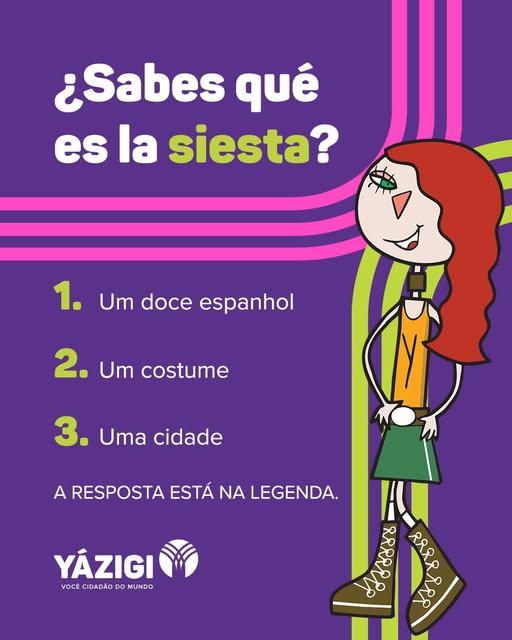 Antes de responder, respira 😌 A siesta não é comida nem lugar. 👉 Resposta certa: opção 2: um costume. Na Espanha, a siesta é a pausa tradicional de 15 e 30 minutos depois do almoço (entre as 14h00 e 16h00), para descansar e recarregar as energias Uma prova de que produtividade não é sobre fazer tudo sem parar, e sim saber a hora de pausar também. 💡 Se um dia você quiser morar na Espanha, trabalhar fora ou simplesmente se virar bem em outro país, começa pelo idioma. Conheça o curso de Espanhol do Yázigi e dê o primeiro passo com mais confiança! Salva esse post e conta aqui: você já se imaginou vivendo em outro país?